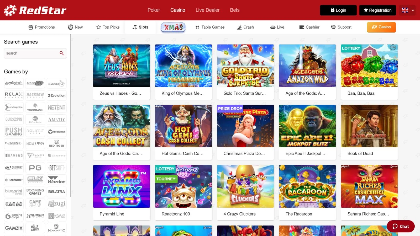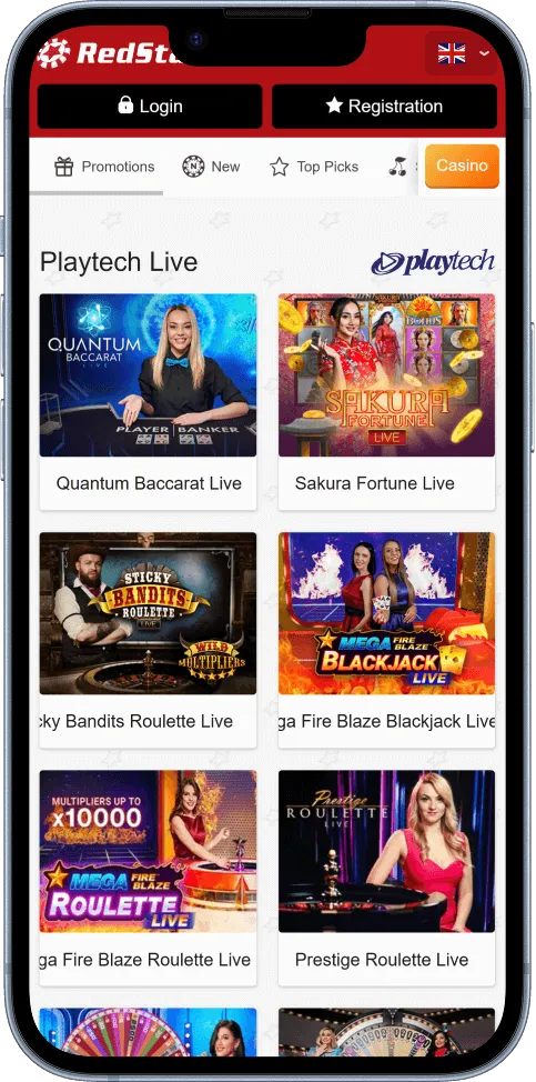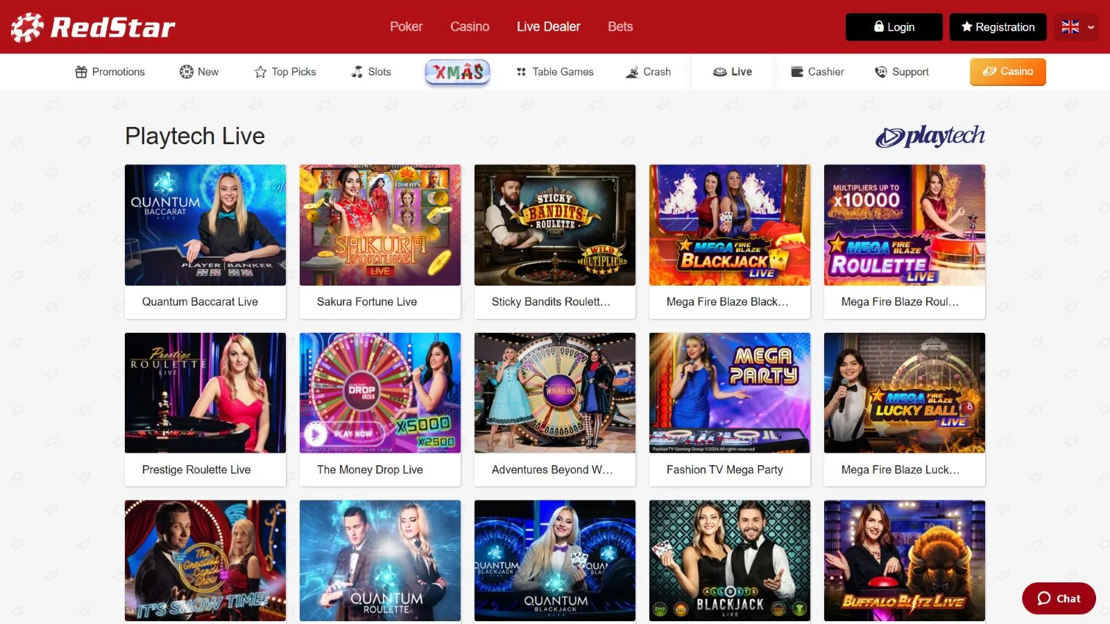 O RedStar organiza sua seção de cassino ao vivo por desenvolvedores, com a Playtech contribuindo com mais de 35 jogos, a Pragmatic Play com mais de 30, a Evolution com mais de 50 e a Ezugi com mais de 20.