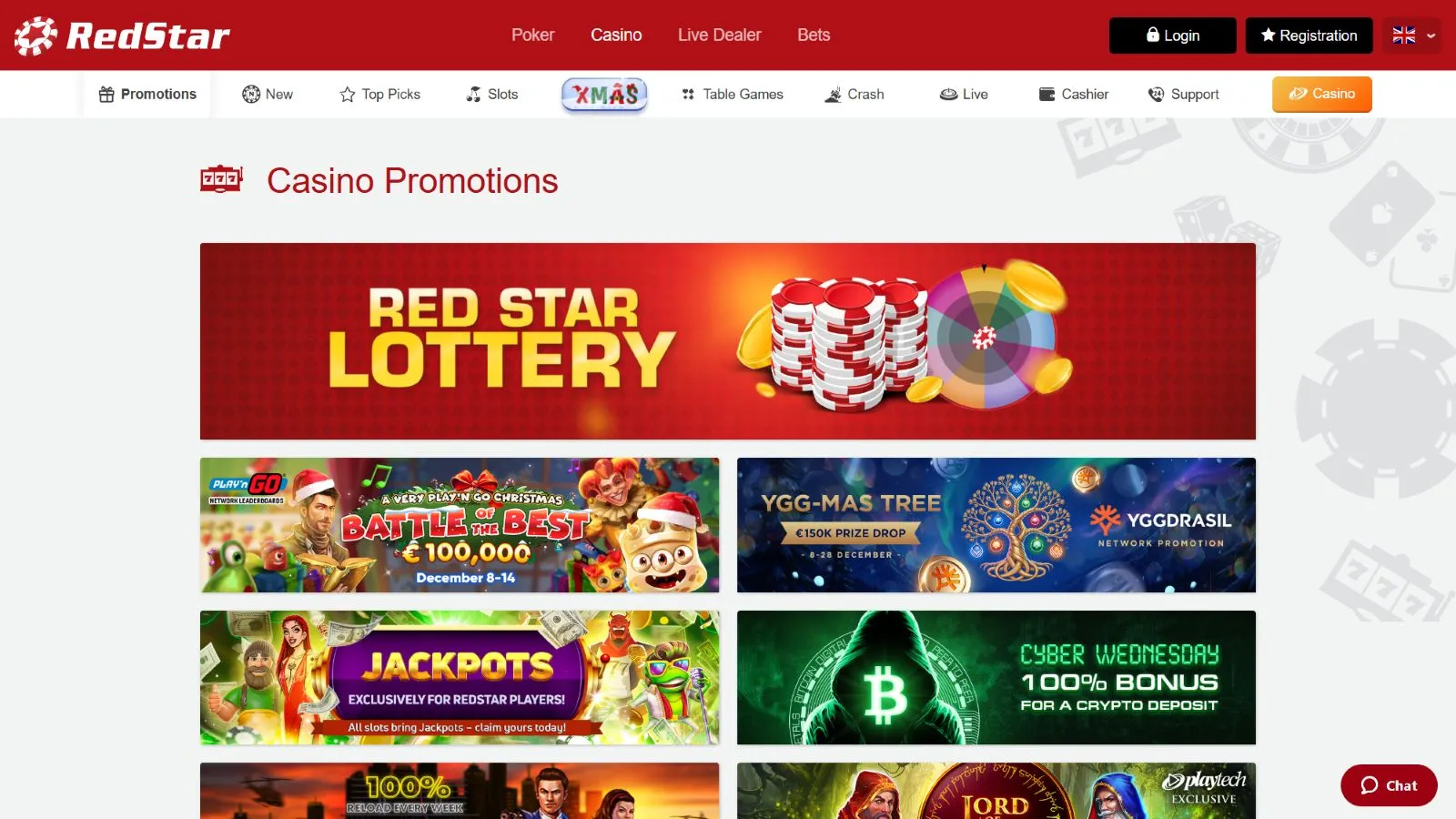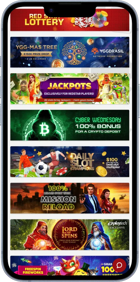 Além do pacote de boas-vindas, o RedStar também oferece promoções adicionais de cassino para jogadores ativos. Um exemplo é o Lord of Spins, uma promoção da Playtech que concede US$ 10 em rodadas grátis em slots selecionados. Essa promoção é válida de maio de 2025 a 30 de dezembro de 2025 e está disponível para depósitos todos os domingos, com códigos de bônus e jogos elegíveis que mudam constantemente.