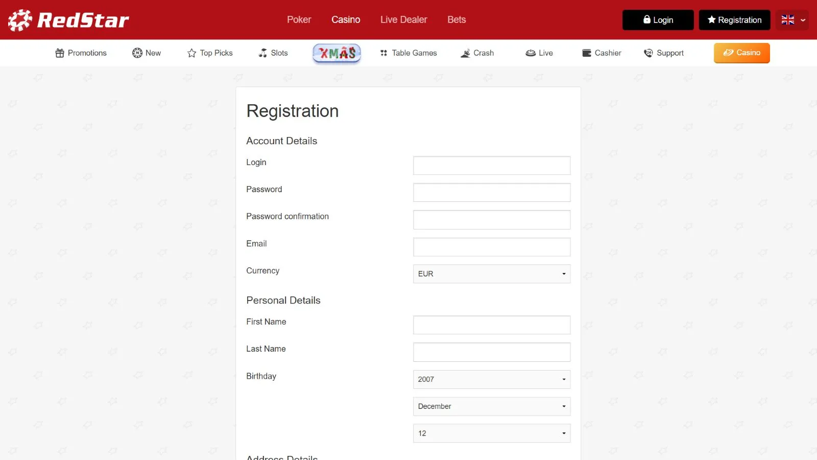 - Visite o site do Red Star Casino e toque em “Registo”.