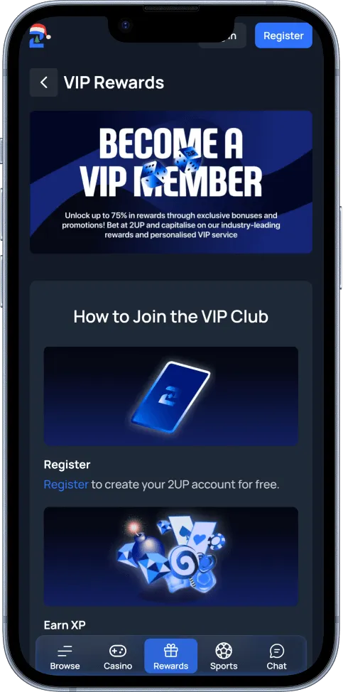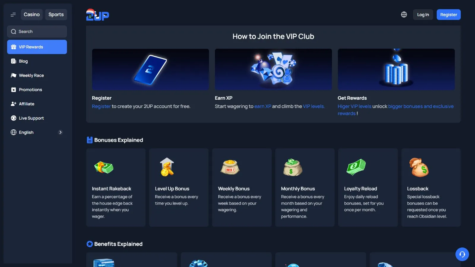If you’re one of the regular gamers at 2UP, you’ll enjoy numerous bonuses and perks from the VIP Club. To join, all you’ve got to do is register and start placing real money bets. You’ll earn XPs as you wager and climb the VIP levels.