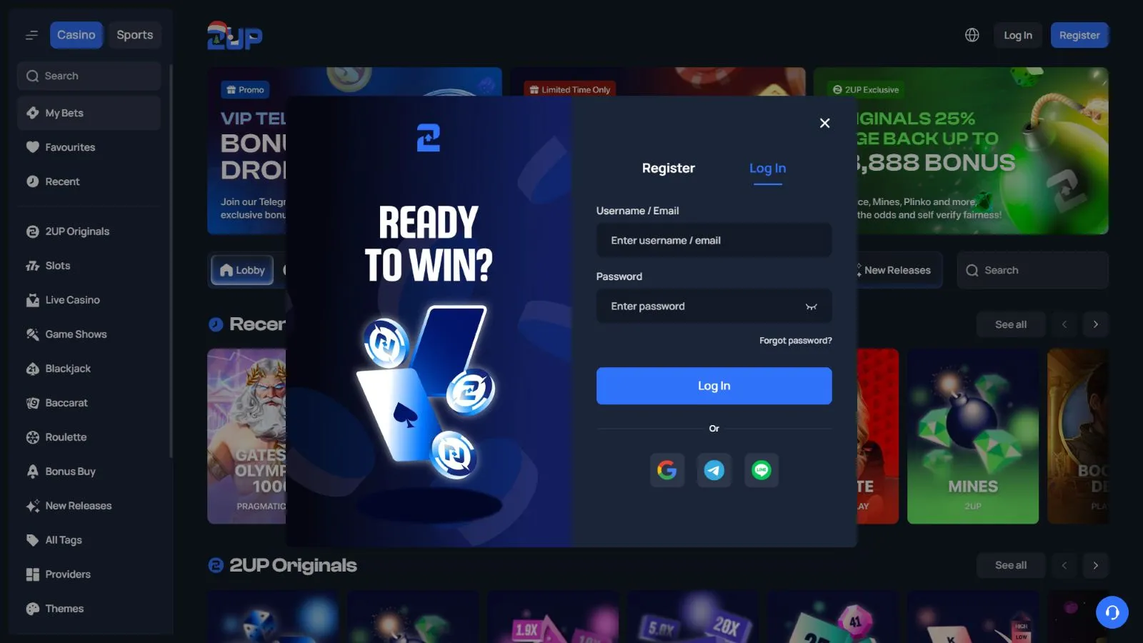 - Log in to 2UP Casino or sign up if you don’t have an account