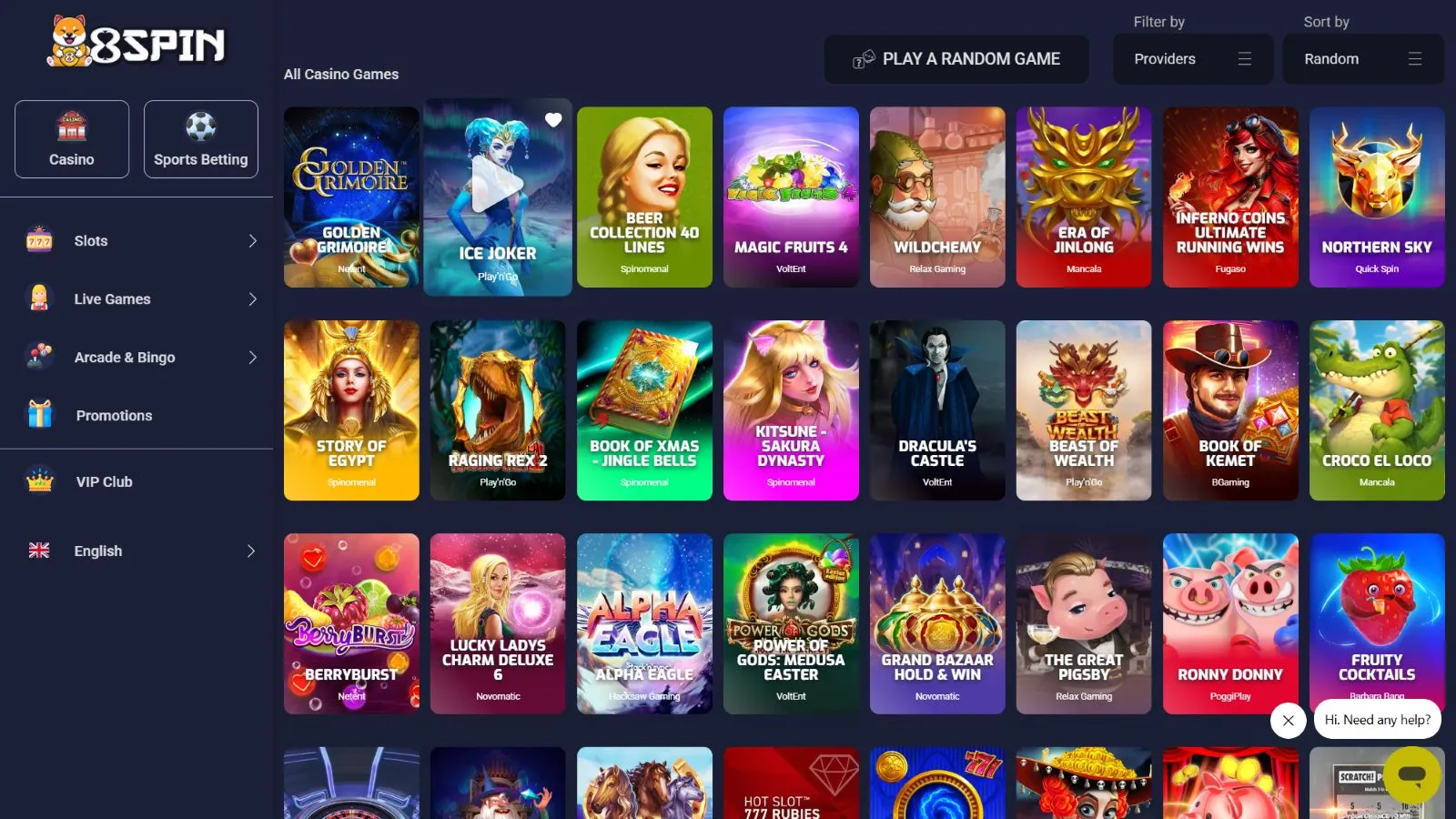 Like many online casinos, slots are the heart of 8Spin’s library. The platform features over 2,400 slots from classic fruit machines to modern video slots and Megaways.