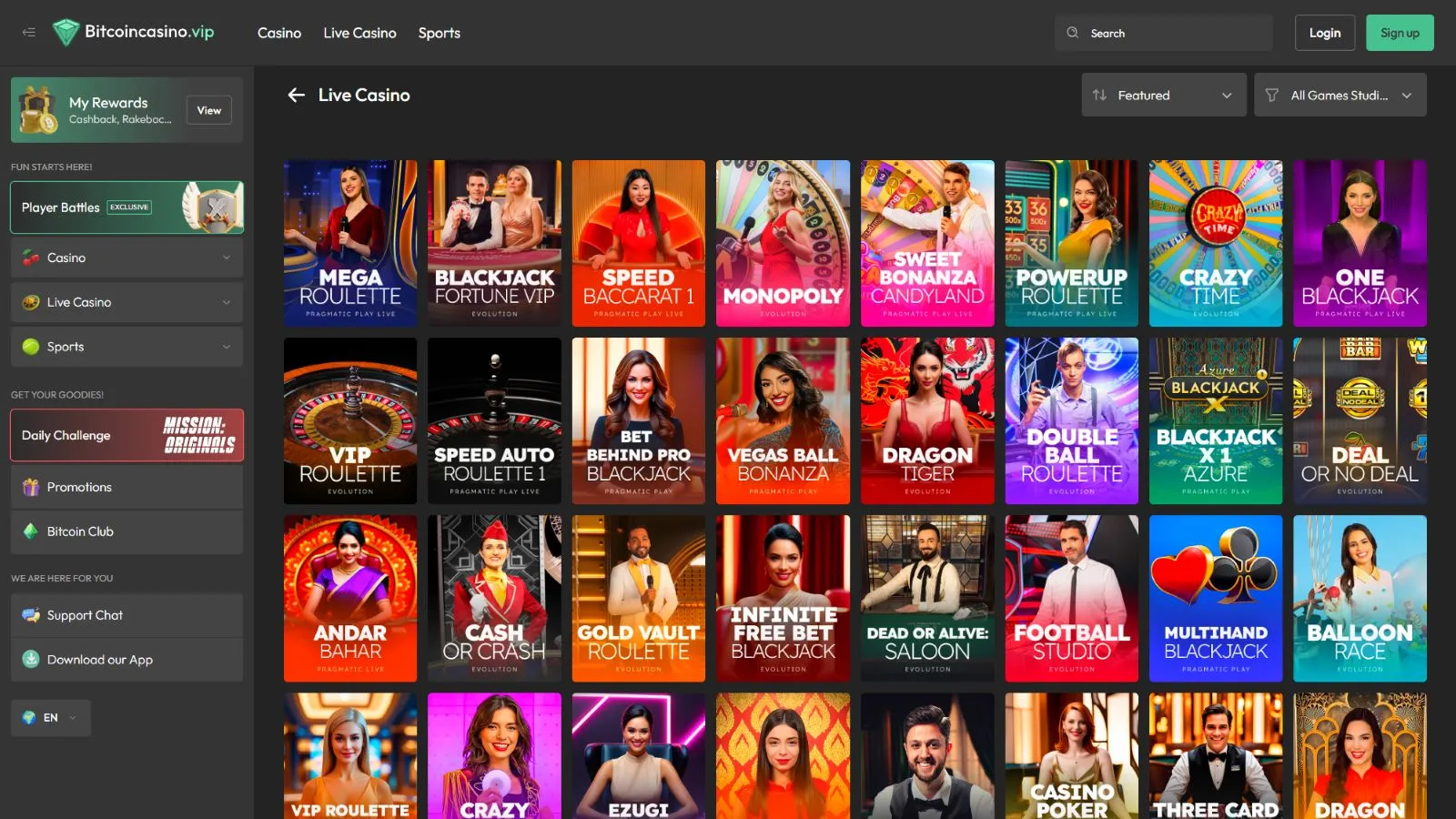 Immerse yourself in the thrill of a real casino at BitcoinVIP, streamed live to your screen. The platform offers an ever-growing selection of thrilling live games. The count is currently at 225+ live games, with all the major table games available.