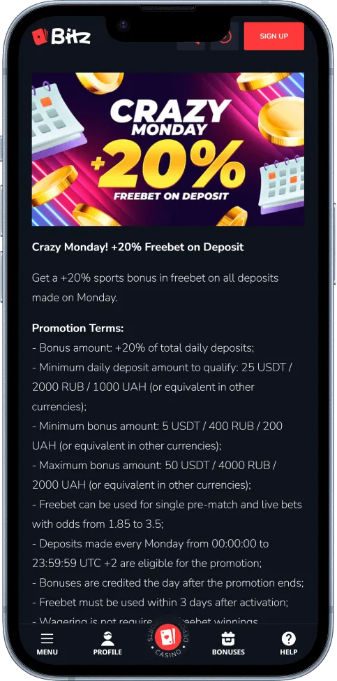 Every Monday, you can claim at least 20% up to 50 USDT in free bets on all deposits made. The minimum deposit amount is 25 USDT.