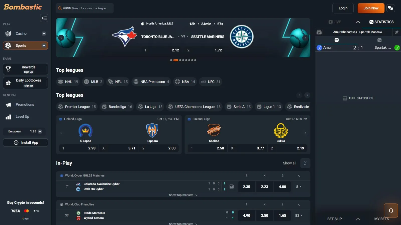 The search bar has handy navigation sections, like “Bombastic Hits,” to help users find games quickly. More than 500 games are available at the online casino, including video slots, live dealer games, crash titles, and more, all provided by industry-leading developers.