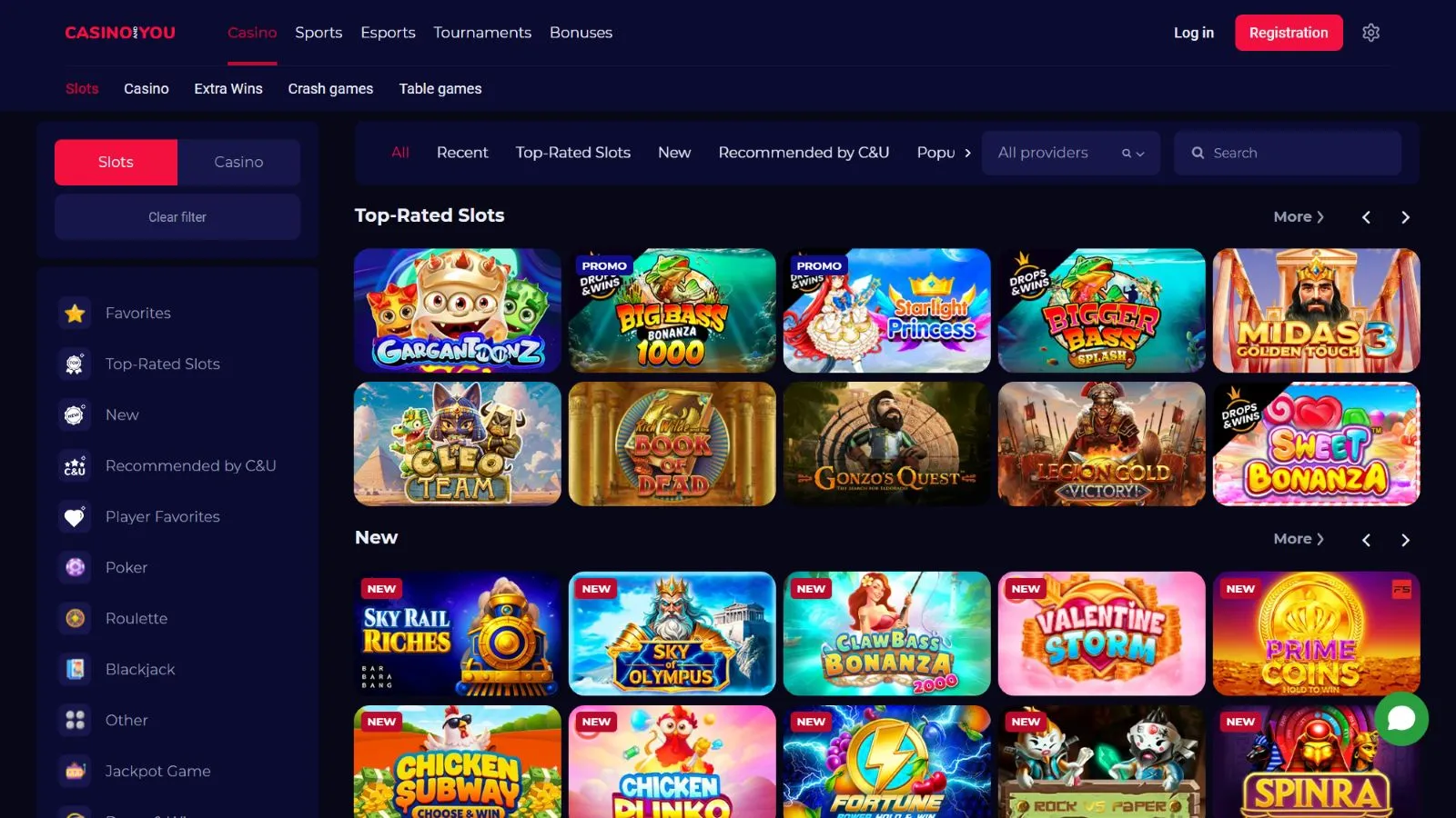 Once you open the CasinoAndYou lobby, the size of the library is hard to miss, with more than 10,000 games in total. Slots make up almost half of the selection, with over 4,700 titles. Table games, crash releases, scratch cards, and bingo round out the rest of the offering.