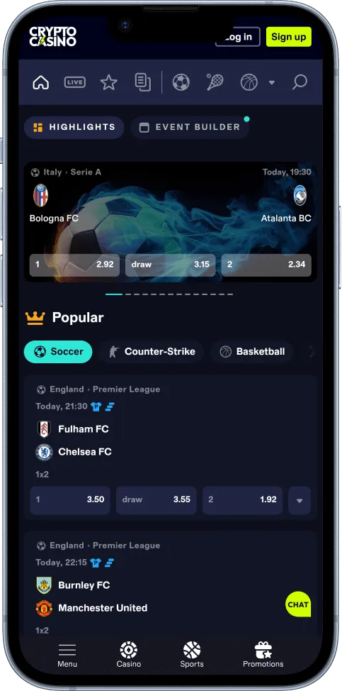 Despite the name, CryptoCasino offers much more than casino games. By clicking the “Sports” tab in the top menu, players can access a powerful sportsbook with an intuitive layout and fast navigation. The left-side menu lets you search events, track My Bets, and browse popular leagues, sports, and competitions, while the main area dynamically displays matches based on your selection.