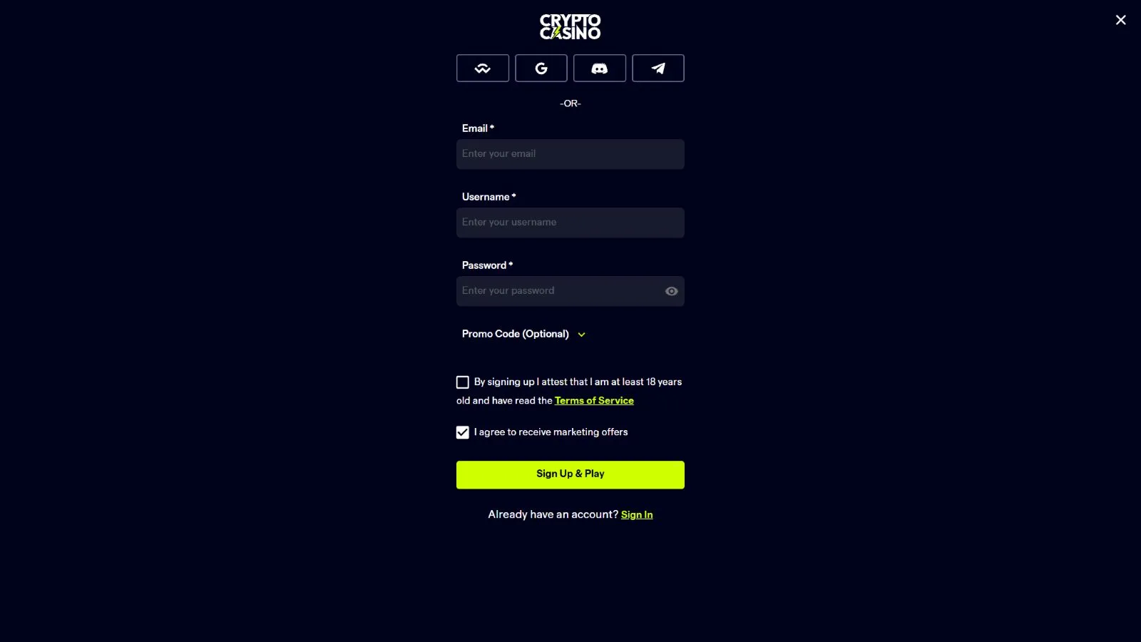 Creating an account at CryptoCasino is quick and straightforward. Click the “Sign Up” button and choose between email registration or Web3 wallet sign-up (for example, via MetaMask).