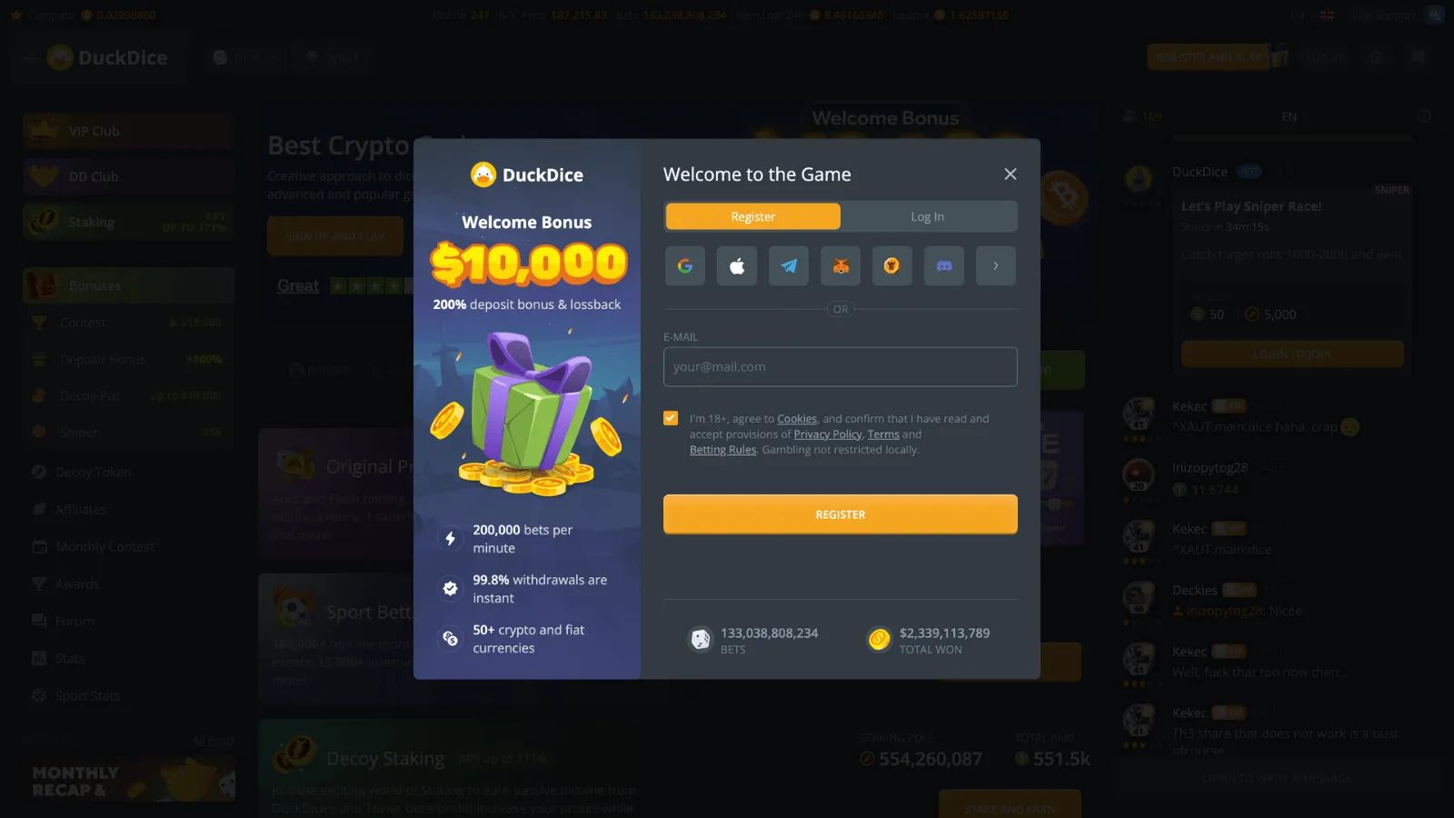 At DuckDice, registration can be done in 30 seconds as only your email is required. Combined with its support for many cryptocurrencies, this enables anonymous payments and worldwide gambling. Both deposits & withdrawals are also processed instantly.