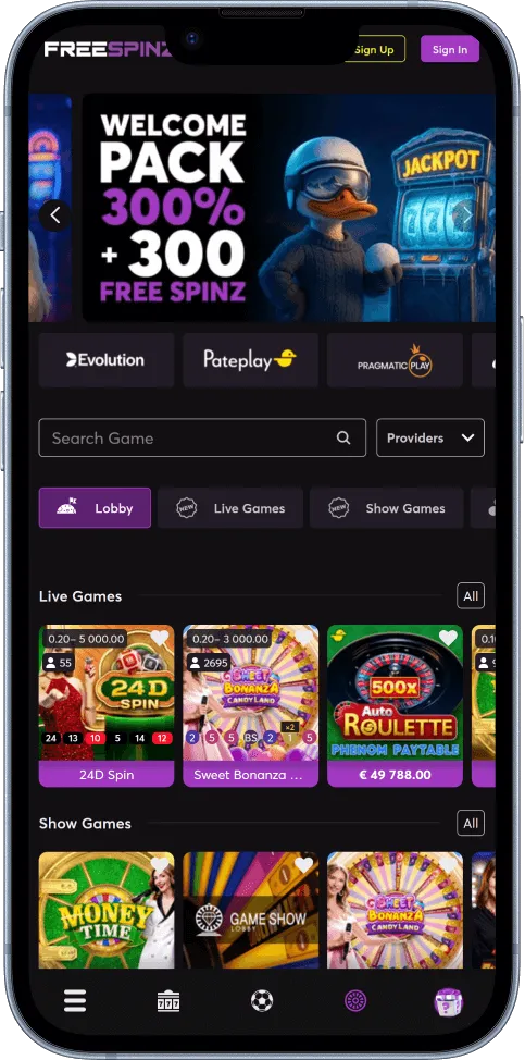 Freespinz doesn’t tiptoe around live gaming; it goes all in. With 600+ live games, the lobby feels like a full-blown casino complex. Evolution, Pragmatic Play, Playtech, Ezugi, and 9 others power up the library.