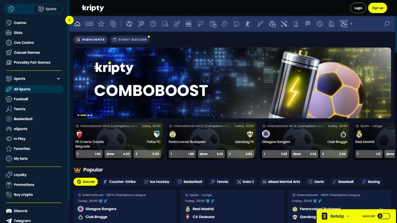 As expected, football, being the most followed global sport, dominates the sportsbook lobby. Kripty offers bets on leagues from various countries, especially Europe. You can stake on thousands of options across the UCL, EPL, La Liga, UEL, French Ligue 1, Bundesliga, and Serie A.