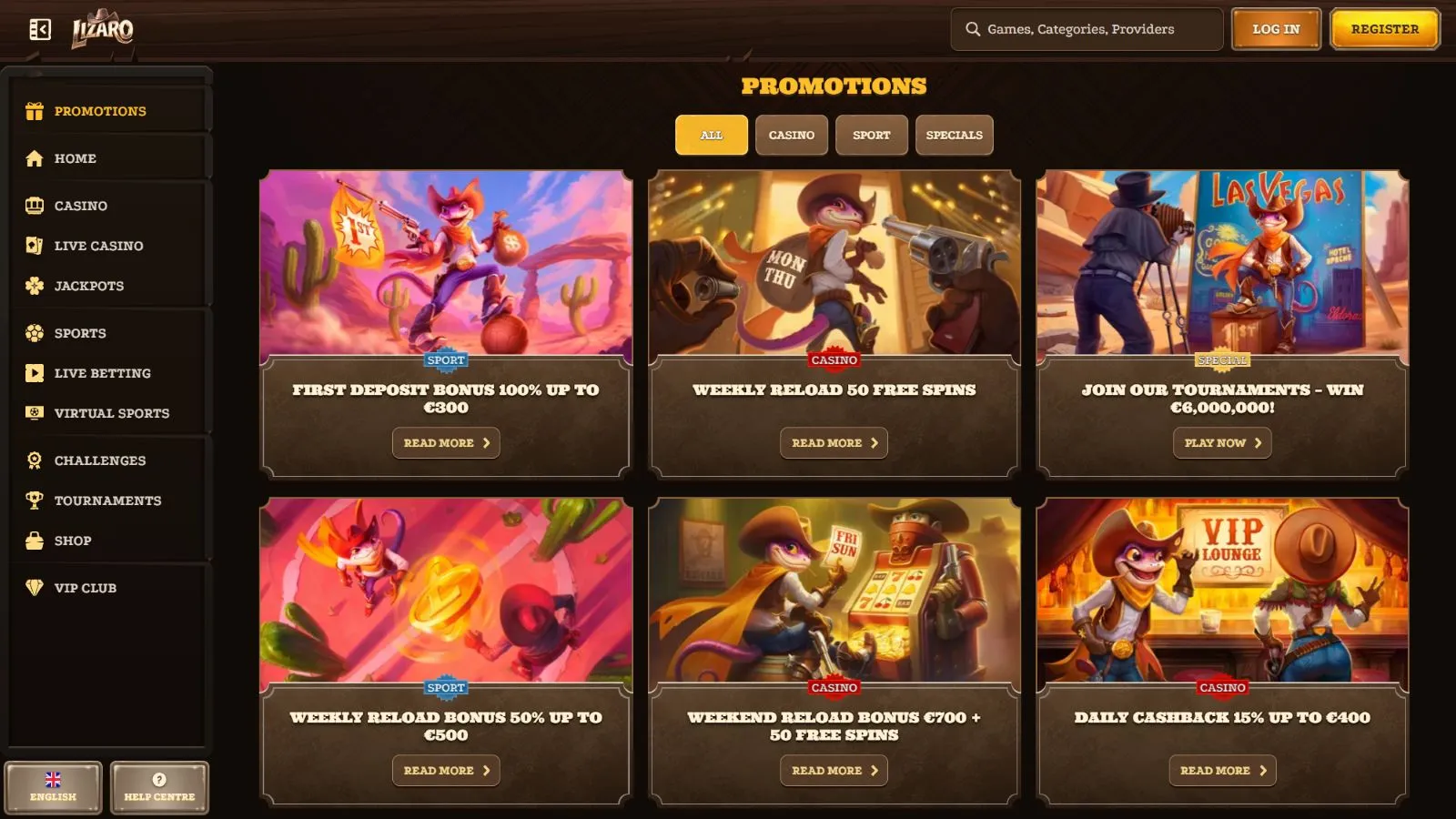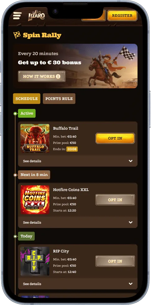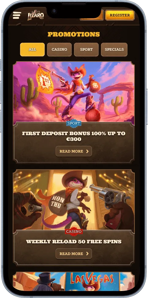Lizaro doesn’t throw you into the wild west empty-handed. Instead, it loads your saddlebag with cash bonuses, free spins, and cashback offers that keep the action going long after your first spin. There’s always something waiting in the saloon.