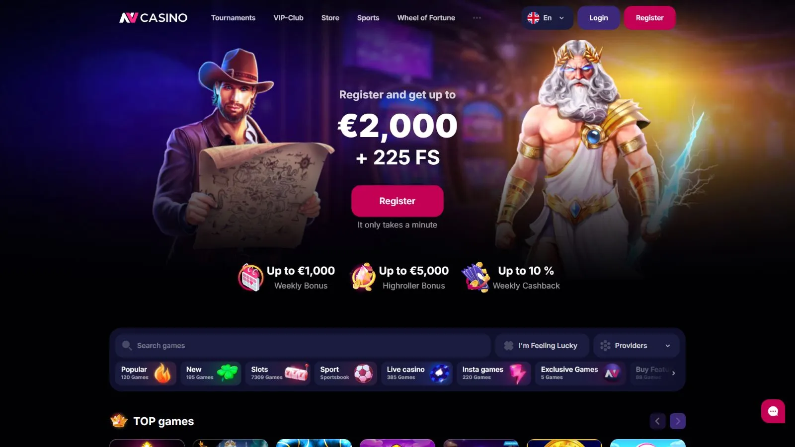 Free spins cost €0.2 per spin, and their winnings must be wagered 30x. The maximum payout is 5x the deposit. You can use the spins on whatever game is selected as the game of the week.