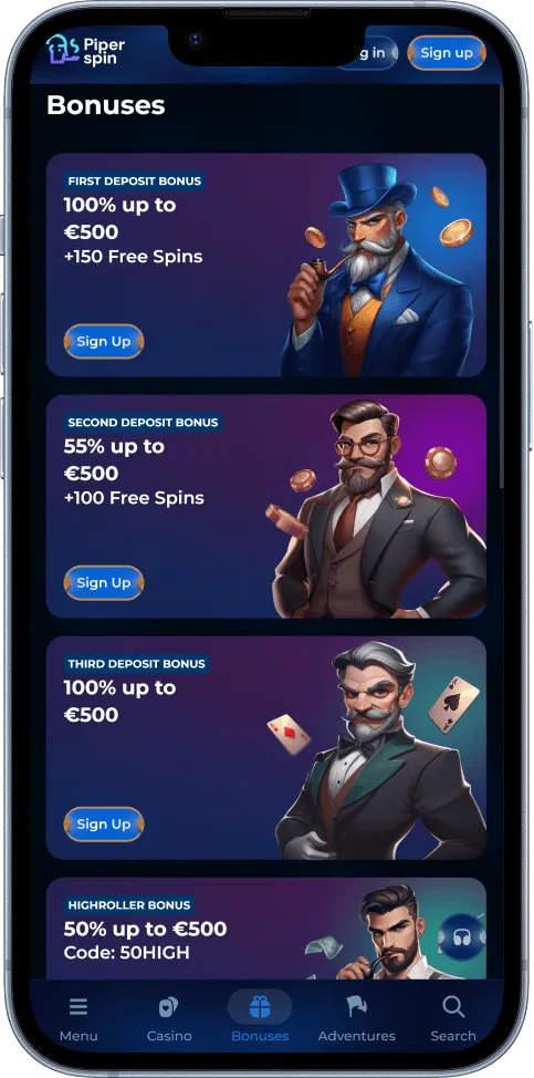 Piper Spin Casino offers you numerous opportunities to boost your bankroll with its bonus lineup and VIP system. You get reload deals, rakeback, cashback, tournament prizes, and coins from missions.