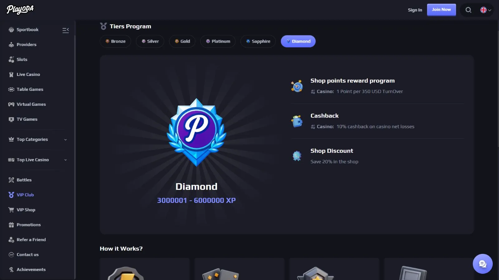 The VIP Club has six tiers with progression based on how often you play. New players will start at Bronze and work their way up the loyalty program. Below we list the levels of Playoda’s VIP Club: