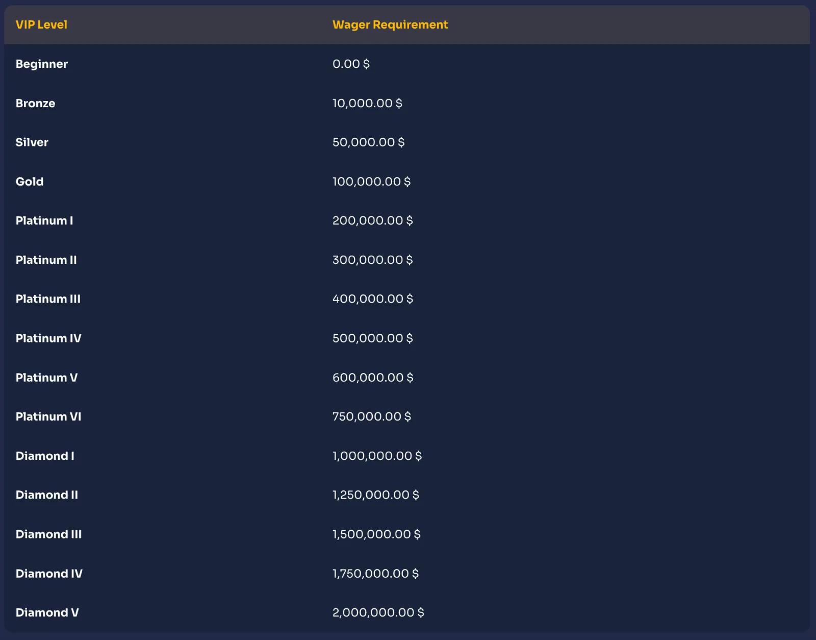 Every new member is automatically in the Beginners status, and you need up to $10,000 in real money bets to reach Bronze. The Platinum tier extends the system with 6 sublevels and the Diamond tier with 5 sublevels.