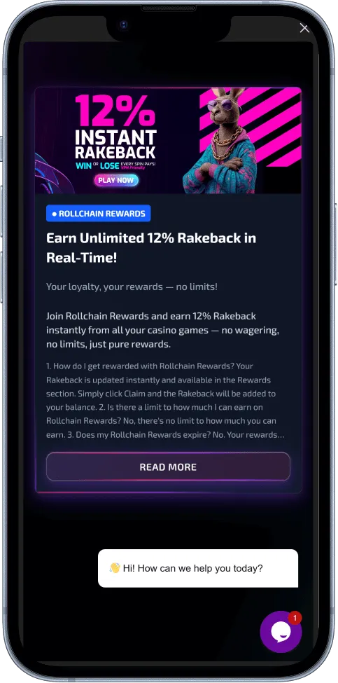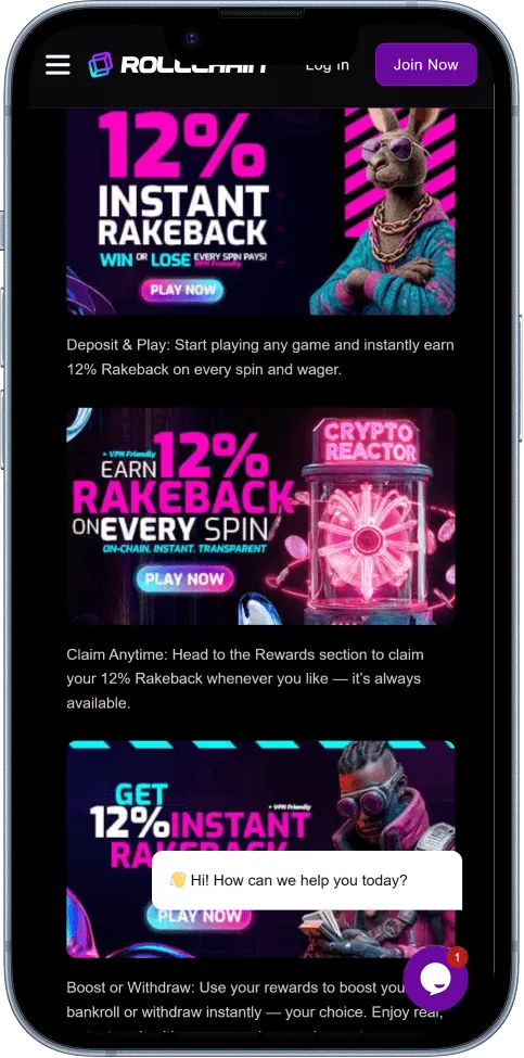 Whether you win or lose from playing with real money, Rollchain awards you a 12% instant rakeback with no wagering requirements. What this means is that you’ll get 12% of the house edge from your bets on the site.