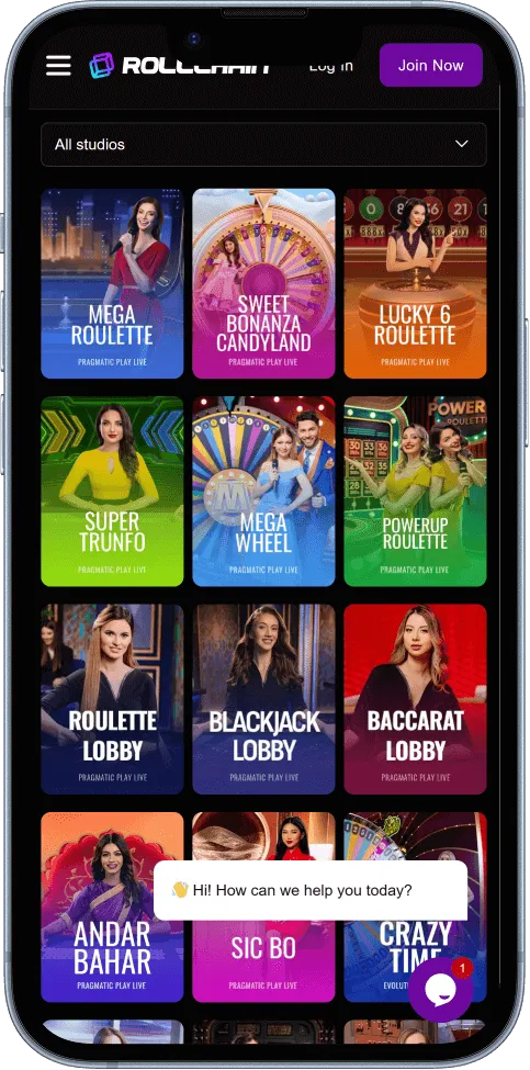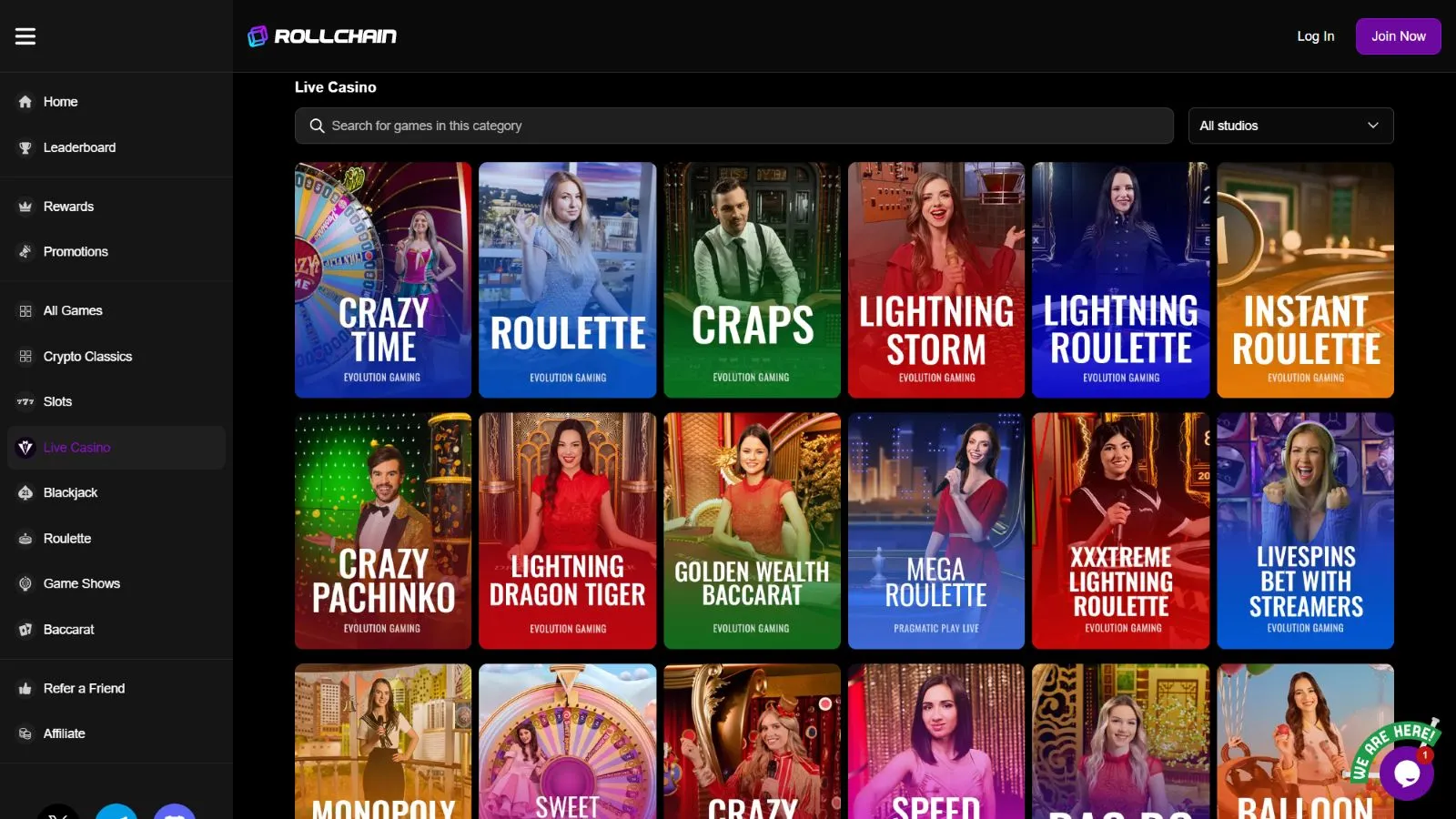 The next major category of games on the casino site is the live casino, with over 600 games. Rollchain displays just around 57 of them, but some offer multiple options.
