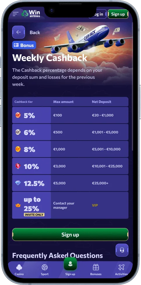 You qualify for weekly cashback at WinAirlines as long as you deposit and make real-money bets during the week. The cashback percentage can be up to 25%, depending on your deposit amount and VIP level.
